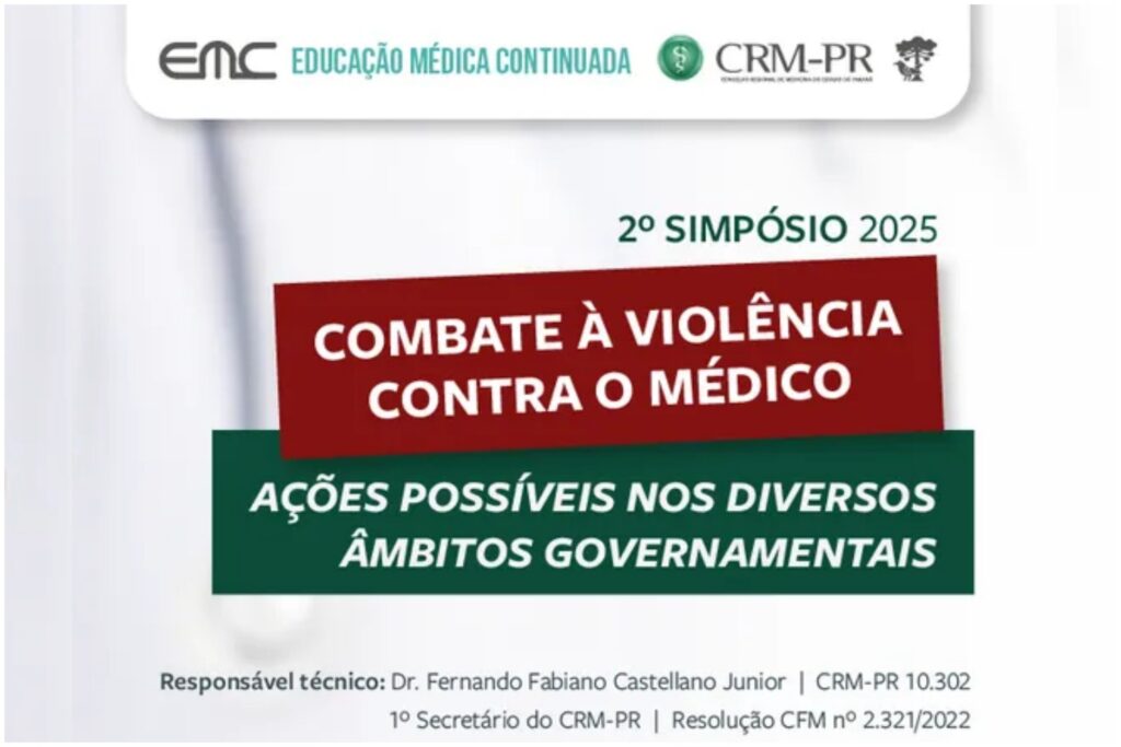 O Conselho Regional de Medicina do Paraná (CRM-PR), por meio do Projeto de Educação Médica Continuada, promoverá o “2º Simpósio de Combate à Violência Contra o Médico – 2025” no dia 25 de junho (quarta-feira), às 19h30. O evento, que será realizado na sede do Conselho em Curitiba, abordará o tema “Ações possíveis nos diversos âmbitos Governamentais”.